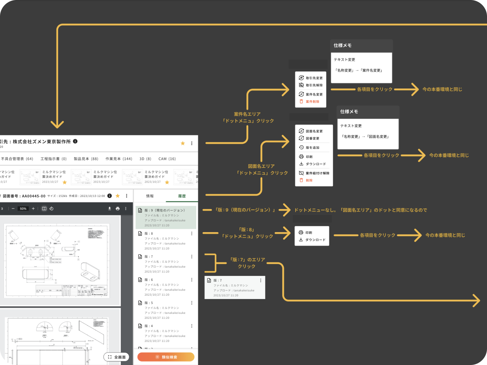 AI機能を多く含む40名規模の工場向けクラウド図面管理システムの新規プロダクトデザインを担当し、プロダクトオーナーと2名で制作しました。外注メンバーによるオールリモート開発で早期リリースが求められ、1ヶ月以内でデザインを完成させました。デザインレビューを密に行いギャップを最小限に抑え、柔軟な設計を心がけた結果、良いチームが形成され開発と運用がスムーズに進んでいます。